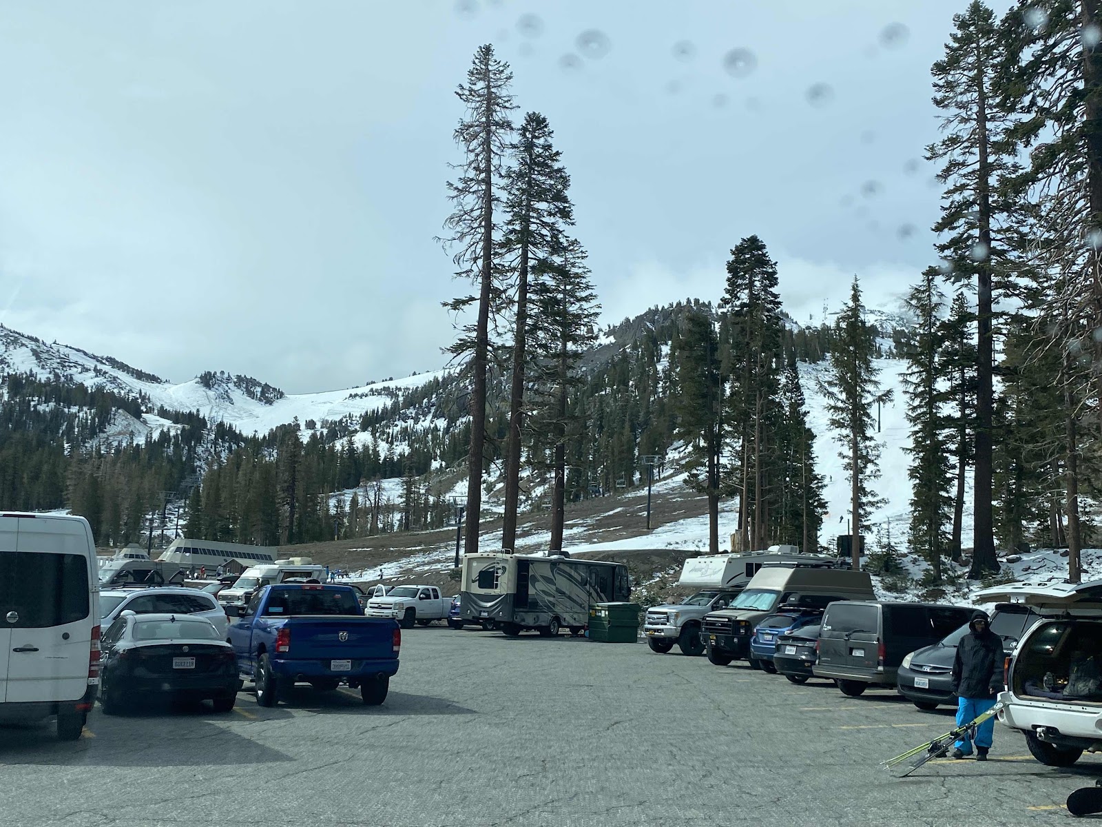 As we left Bishop our weather turned wet, cold and snowy!! Going up to Mammoth is about 7000 ft and it was our first long haul. The truck did great. We were surprised to see the park was almost full!!! The folks that checked us in had to put us in a 30 amp spot. It was a blizzard with snow covering us as we parked and both set up. We had a dickens of a time getting into our spot because of a few parked cars in front of us :(. But Papa negotiated it. Once we got inside we turned on our heat sources and cranked up the furnace. After several disappointing tries we gave up. It never would ignite. We dressed warmer and hot out the electric blanket we had packed just in case!!! Betsy Story you would have been proud of me. We had a very toasty night and Frazier jumped up on the bed that night!!! He never does that but I think somehow he knew there was a warmer spot up there than anywhere else in the rv. It snowed most of the day. We did take the truck off the rv the next morning so we could go explore more of the town and ski hill. We also needed diesel. We were shocked to see a huge crowd of folks skiing!! The gondola and chair lift were both running. Almost all parking lots were full. Hence the reason the rv park was full. It was still windy and cold. Not a great sunny spring day but when you are a hard core skier you indulge yourself.